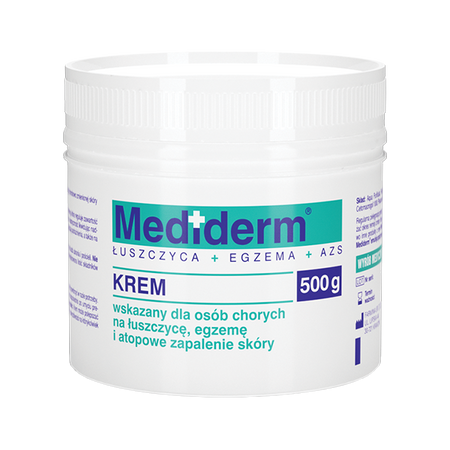 - Krem Mediderm to specjalny emolient, stworzony do pielęgnacji skóry wrażliwej oraz chorobowo zmienionej w przebiegu łuszczycy, egzemy i atopowego zapalenia skóry.