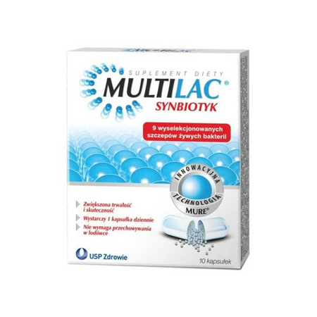 - Multilac to nowoczesny symbiotyk zawierający aż 9 specjalnie wyselekcjonowanych szczepów żywych kultur bakterii oraz probiotyk w postaci fruktooligosacharydów.