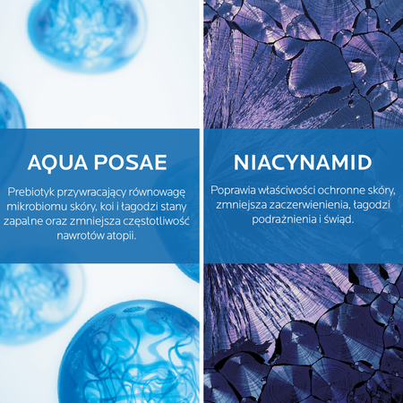 Ultradelikatna formuła kremu myjącego do ciała, wzbogacona o Masło Shea i Niacynamid, w połączeniu z Aqua Posae Filiformis, nowym i opatentowanym składnikiem aktywnym aby działać na czynniki determinujące atopowe zapalenie skóry. Bez mydła, bez zapachu, bez parabenów.