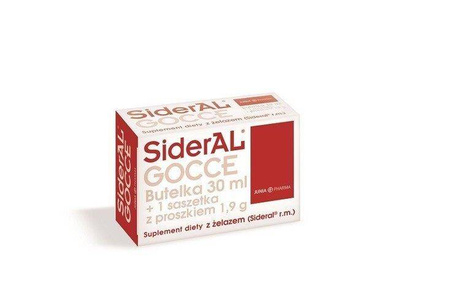 SiderAl GOCCE to doustny preparat uzupełniający 50% dziennego zapotrzebowania organizmu na jony żelaza. Żelazo jest niezbędne do produkcji hemoglobiny i czerwonych krwinek oraz do transportu tlenu we krwi. Reguluje metabolizm energetyczny komórek całego ciała oraz utrzymuje prawidłowe funkcje poznawcze i psychologiczne.
