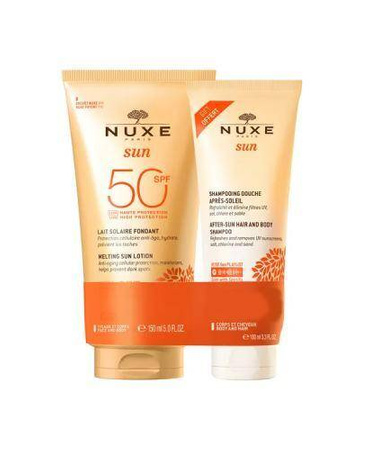 - NUXE Sun Mleczko do opalania twarzy i ciała spray SPF50 i Żel pod prysznic po opalaniu to zestaw produktów kosmetycznych opracowanych do pielęgnacji i ochrony skóry.